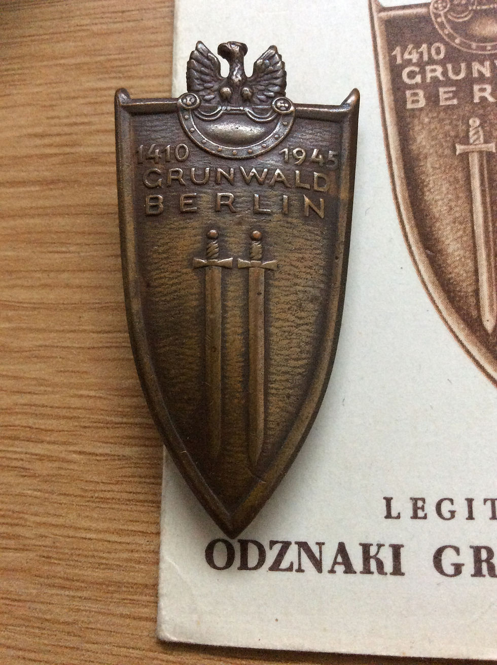POLISH GRUNWALD BADGE FOR WW2 WAR WITH GERMANY WITH DOC DATED 1975